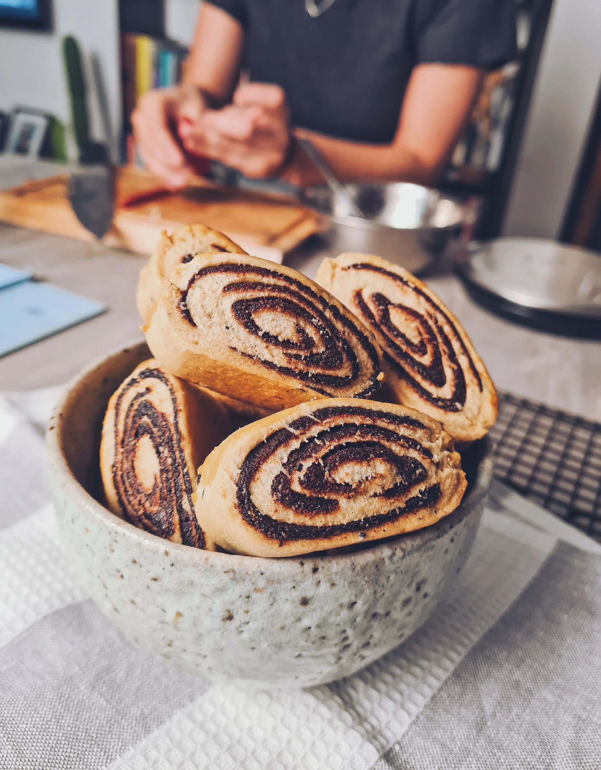 Preheat oven to 180°C and begin to roll the dough lengthwise until it resembles a log and pinch the flap into the dough to close it up (pictured below).