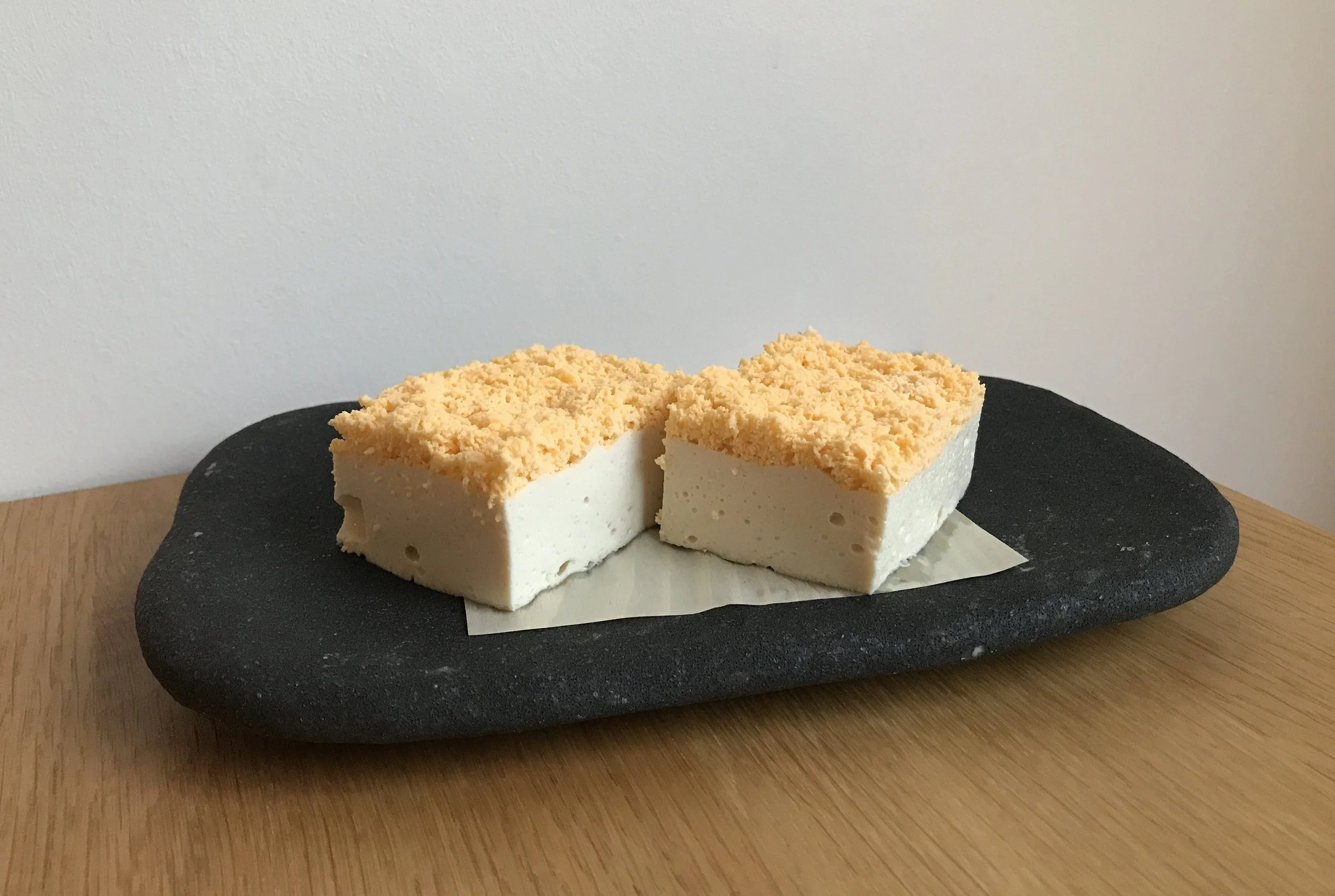 Image description: A dark grey stone plate holds two pieces of Golden Sand Tofu on a wooden table against a white wall backdrop. Photograph: Sava Goto.