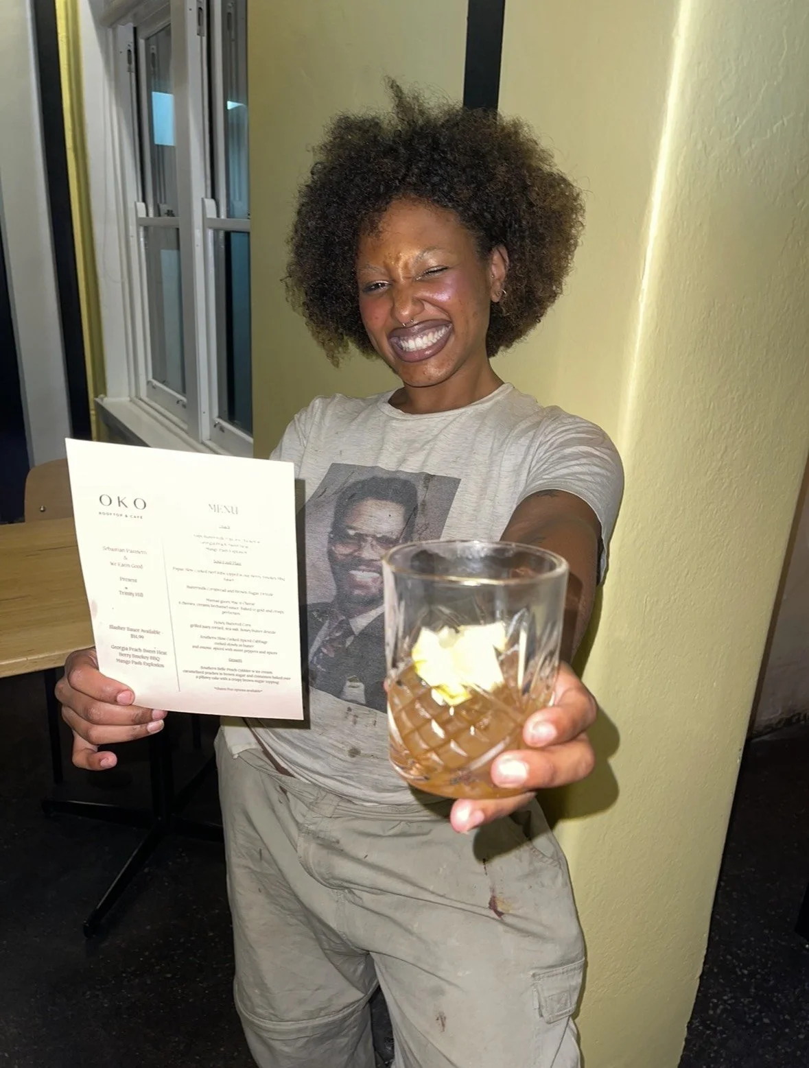 Image description: Trinity stands smiling, one arm is outreached with a cocktail in hand towards the camera, and the other holds a menu from her pop-up at Oko Cafe. Photograph: Trinity Hill.