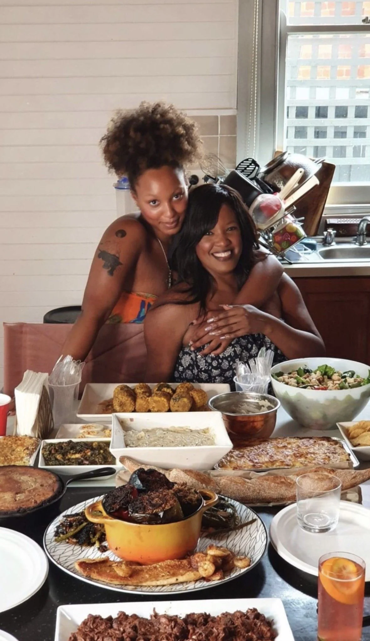 Image description: Trinity stands, with her arm over a smiling friend who is sitting down. In front of them both is a table covered in different dishes full of food. Photograph: Trinity Hill.