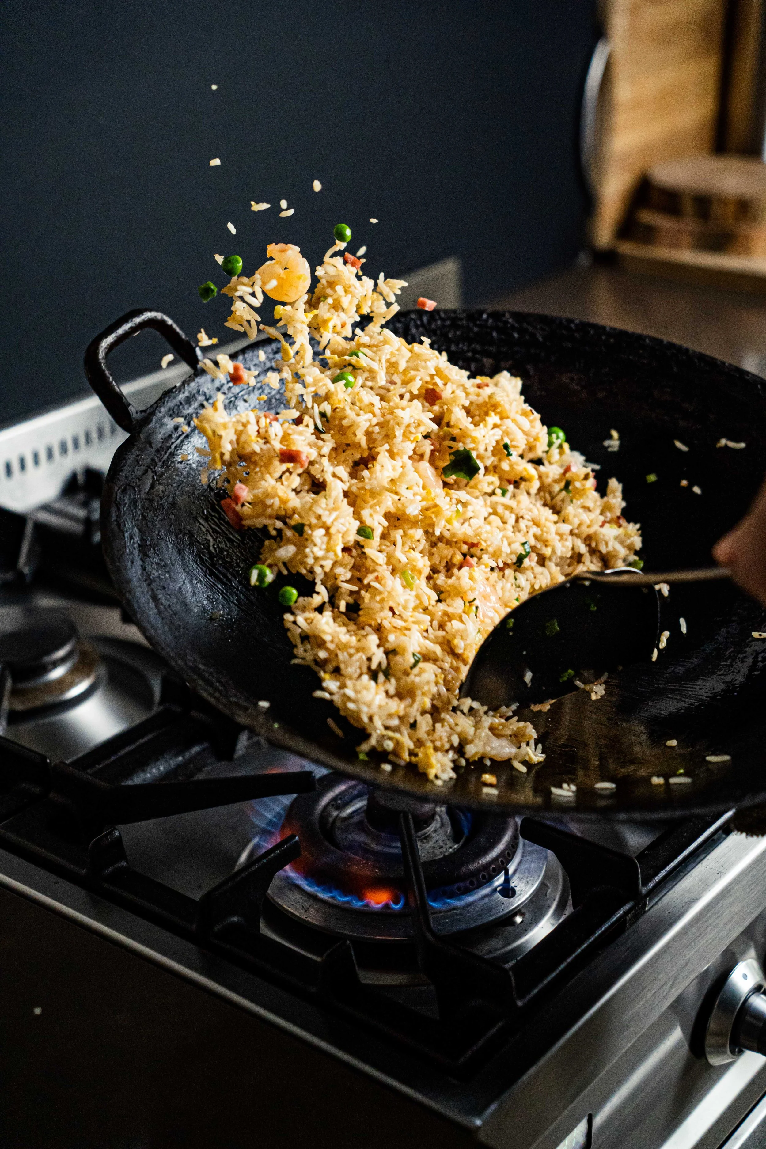 Image description: Fried rice lifts off the side of a black wok in the air, the wok is placed over the burner on a stove. Photograph: Brian Tam